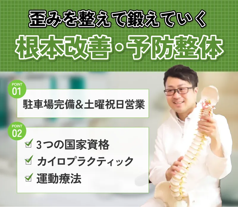 身体の痛みや不調は生活の質を低下させ、出かけるのが億劫になったり運動がしにくくなったり、様々な悪影響が現れます。「肩が痛くて仕事がつらい」「寝ても休んでも疲れが取れない」など、日常を脅かす不調や痛みの軽減を目指し、一人ひとりの原因に合わせたカイロプラクティックによるポキポキしない骨盤矯正や背骨矯正、ほぐし施術、鍼灸のほか、運動プランの考案や生活習慣へのアドバイスを整骨院として実施しています。福山市にて完全予約制による施術で待ち時間を短縮し、施術にかける時間をしっかりと確保できるように努めています。土曜日や祝日にも対応しているため、多忙な方にも安心です。